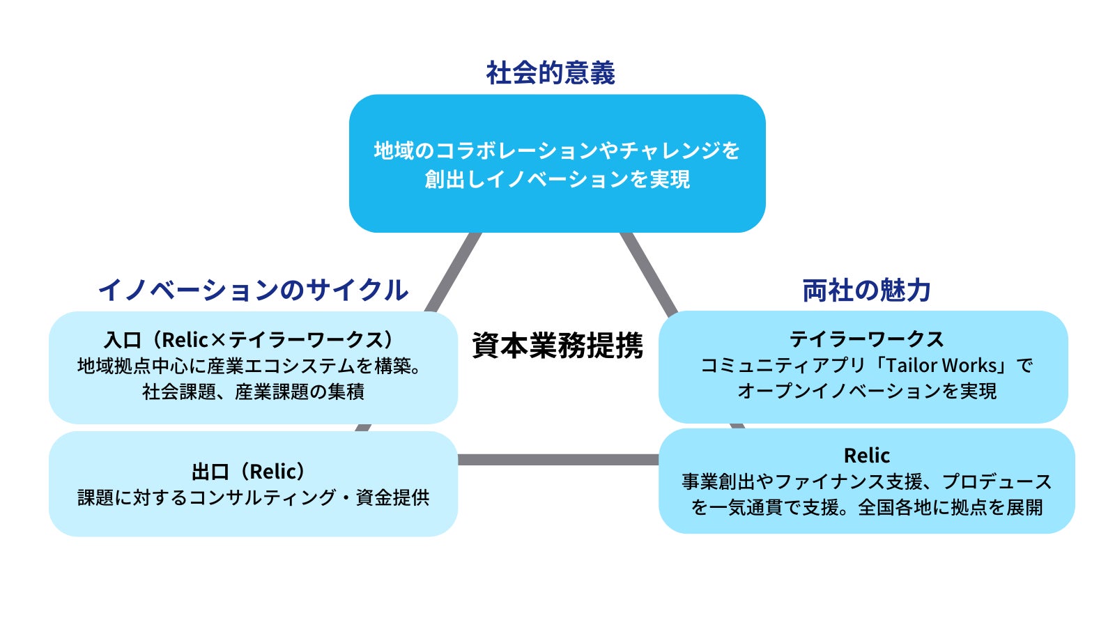 両社は、イノベーションの共創と地域産業の活性化という点で共通の理念を持っており、Tailor Worksを活用した課題の抽出と体系化、さらにRelicの各種拠点及びサービスを通じて課題に対するソリューション提供を行うことで、全国各地の産業課題解決が推進されることを見据え、この度の資本業務提携に至りました。